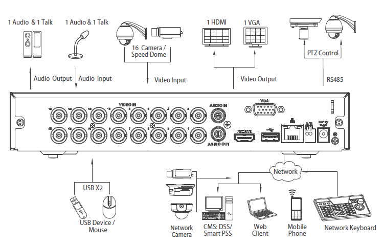 | Çözünürlük | HDMI: 8CH: 1920 × 1080, 1280 × 1024, 1280 × 720 16CH: 3840 x 2160, 2560 × 1440, 1920 × 1080, 1280 × 1024, 1280 × 720 VGA: 1920 × 1080, 1280 × 1024, 1280 × 720 |